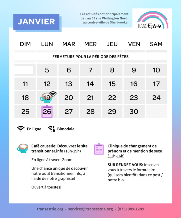 TransEstrie a pour mission principale de soutenir les communautés trans et non-binaires de l’Estrie en créant des services qui leur sont destinés et en représentant leurs intérêts auprès des institutions, organismes et établissements de l’Estrie afin que leurs services soient adaptés aux réalités trans et non-binaires.