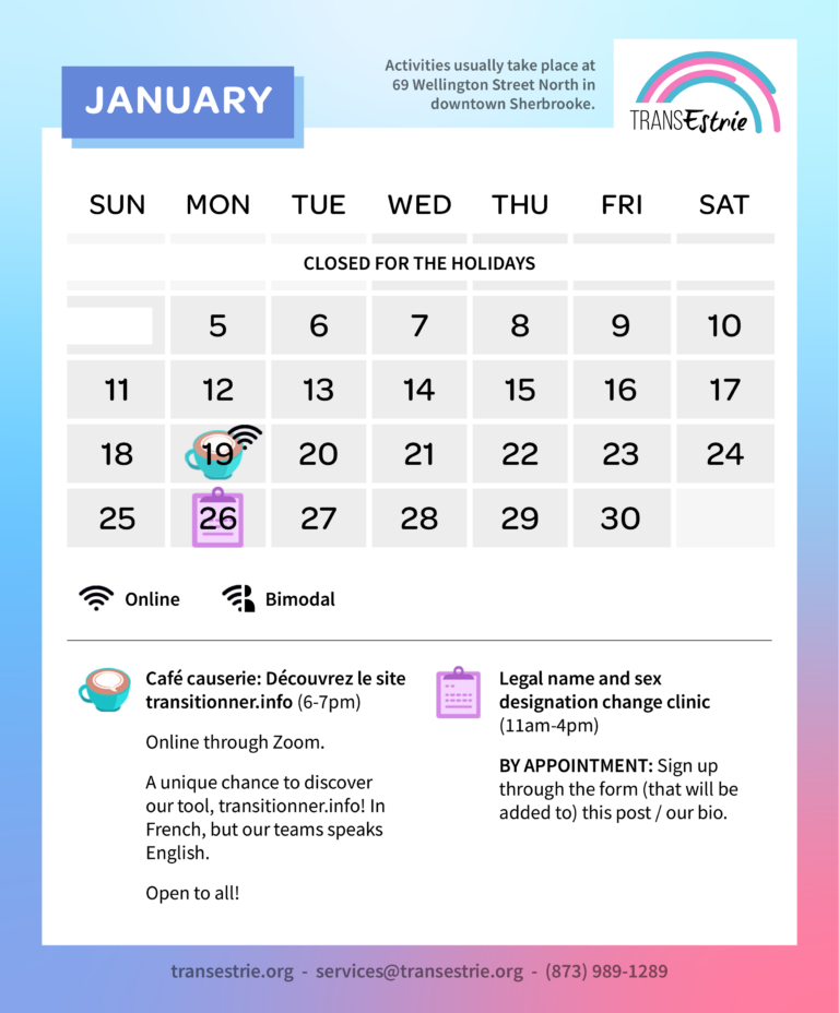 TransEstrie’s main mission is to support the trans and non-binary communities of Estrie by creating services for them and by representing their interests to institutions, organizations and establishments in Estrie so that their services are adapted to trans and non-binary realities.