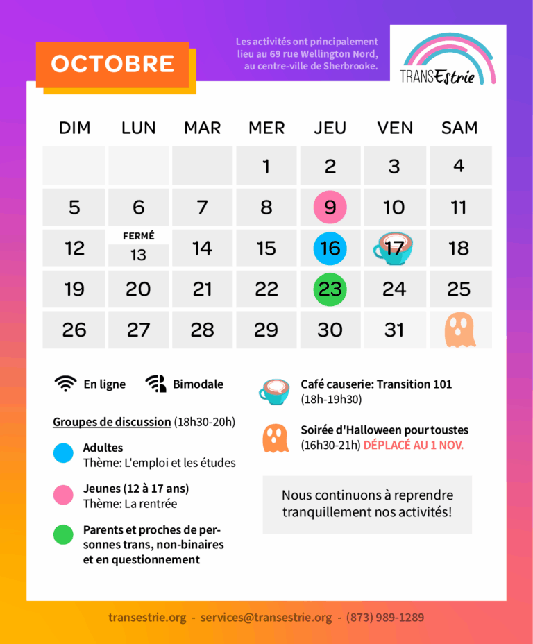 En personne: de 18h30 à 20h, une fois par mois. Les groupes de discussion permettent de s'outiller pour bien s’adapter au coming-out et à la transition de son parent, enfant, conjoint.e, membre de la famille ou ami.e. Il se tient au 69 rue Wellington Nord, Sherbrooke. Celui de ce mois-ci est jeudi le 23.
