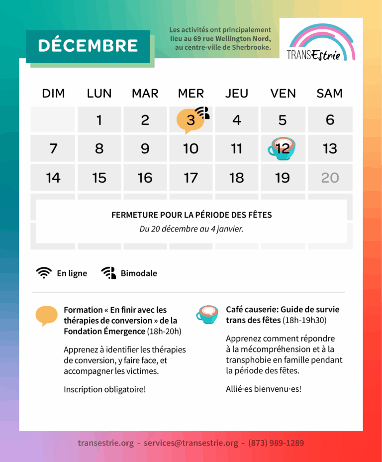 Sauf à indication contraire, nos activités ont lieu à nos bureaux, au 69 rue Wellington Nord, à Sherbrooke.