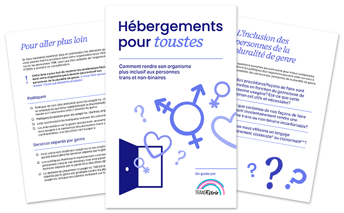 Un guide sorti du CALACS de l’Ouest-de-l’Île expliquant que le féminisme intersectionnel inclut les personnes trans et non-binaires et comment adapter ses politiques pour inclure ces personnes dans les hébergements. (Français)